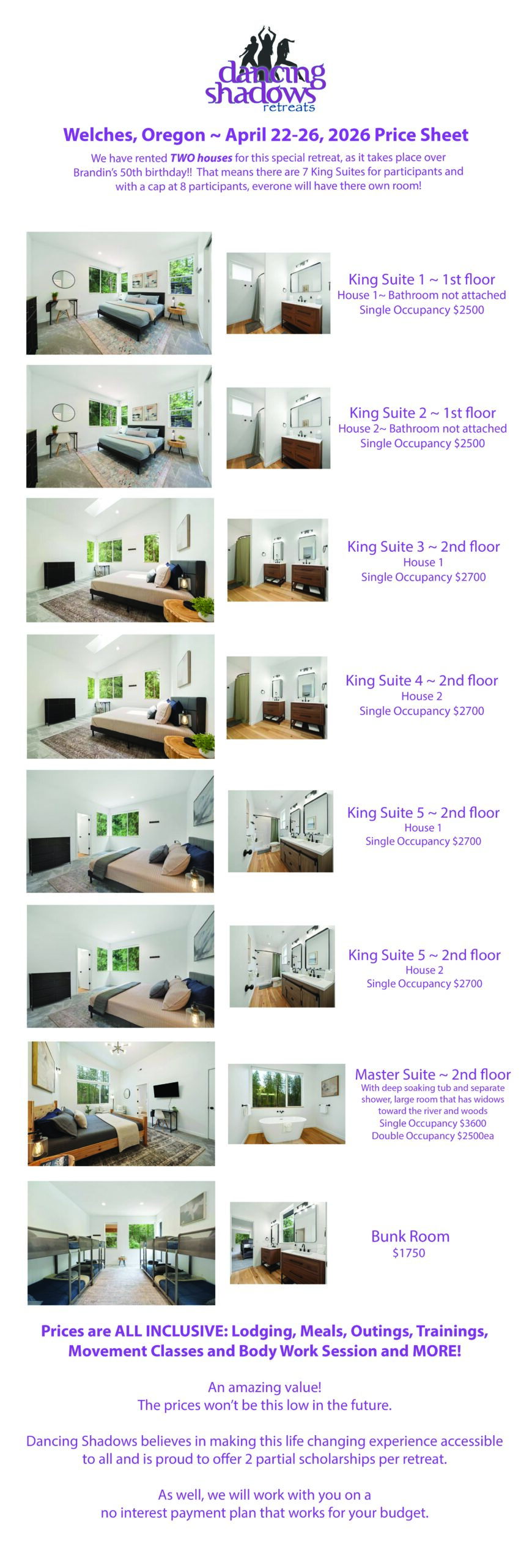 - Wednesday April 22: Arrive between 1-4pm, bodywork sessions begin at 3. Welcome dinner and introductions, settle in with grounding Sound Bath.